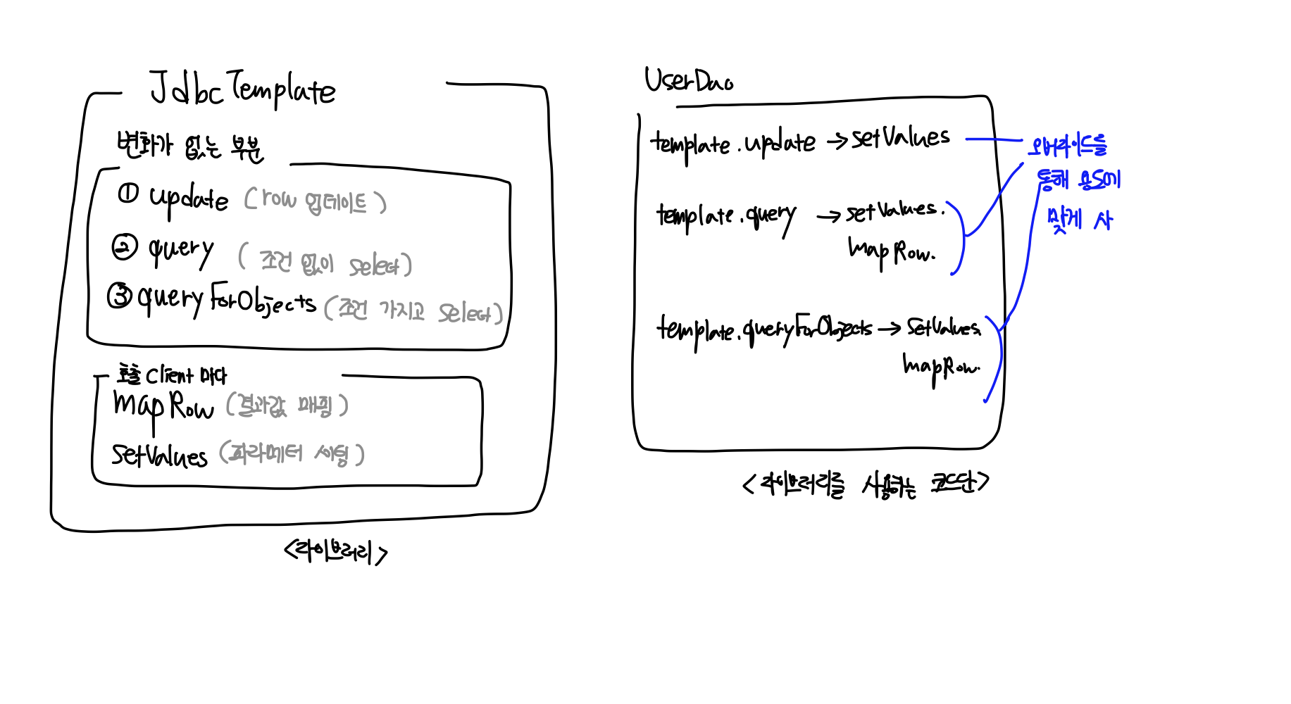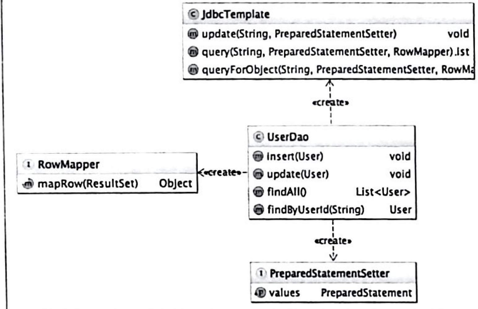 위 구조에서는 클라이언트 (UserDao), 템플릿(JdbcTemplate), 콜백인터페이스(PreparedStatementSetter, RowMapper) 가 있다.