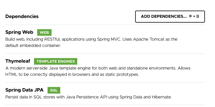 의존 관계: Spring Web / Thymeleaf / Spring Data JPA / H2 / Lombok