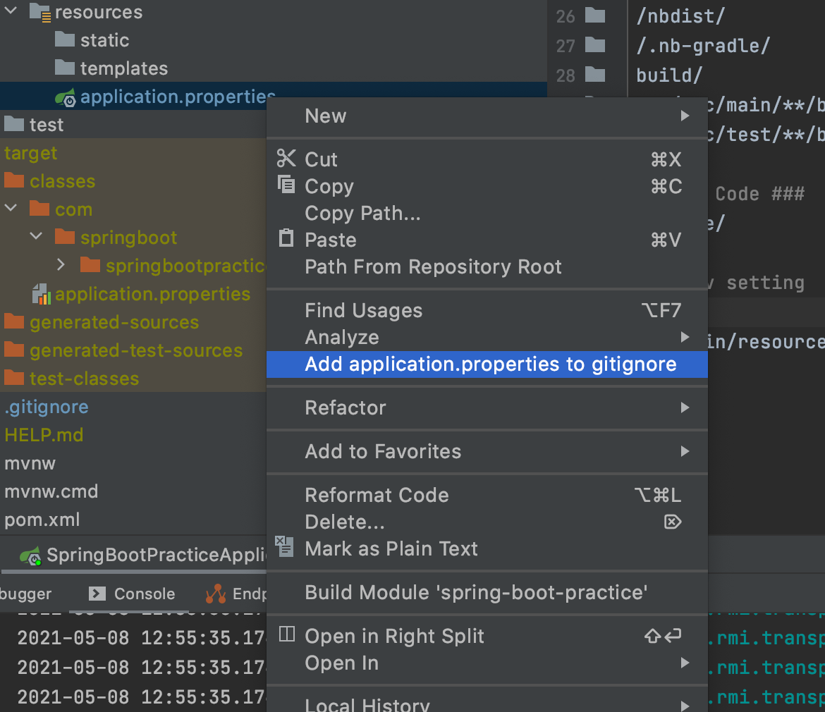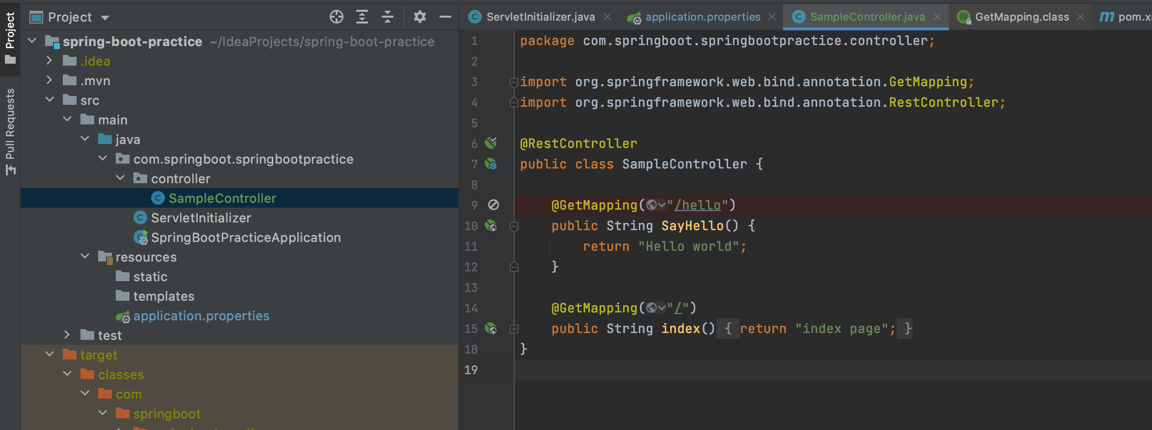 위 구조에서 SpringBootPracticeApplication는 main 클래스이다. 다른 컨트롤러가 이와 같은 depth에 존재할 경우, main 클래스는 정상 동작하지 않는다. 타 controller를 추가할 경우, root package(여기서는 com.springboot.springbootpractice) 의 하위에 package를 추가 후 그 아래에 controller를 추가해야만 한다.