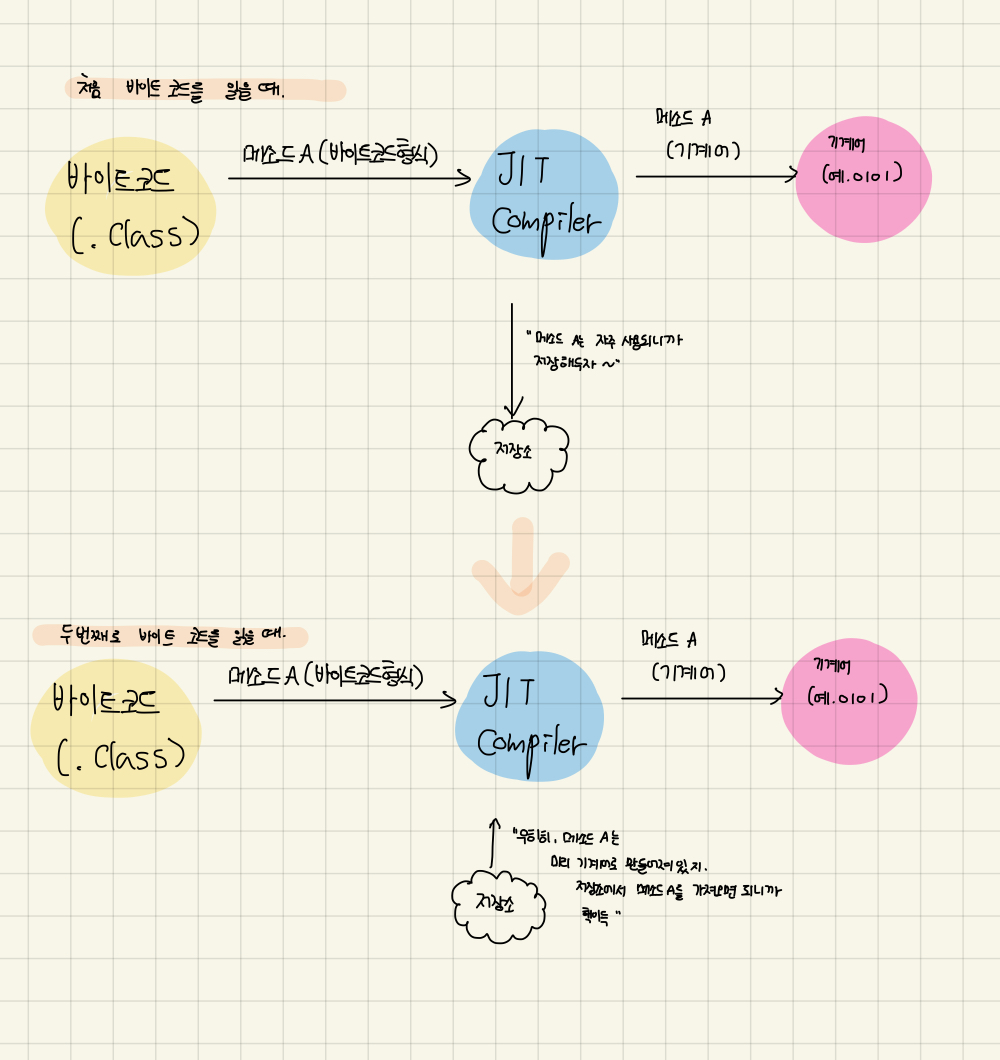 JIT 컴파일러는 인터프리터가 반복해서 읽어야할 코드는 저장소에 미리 번역하여 저장해둔다.