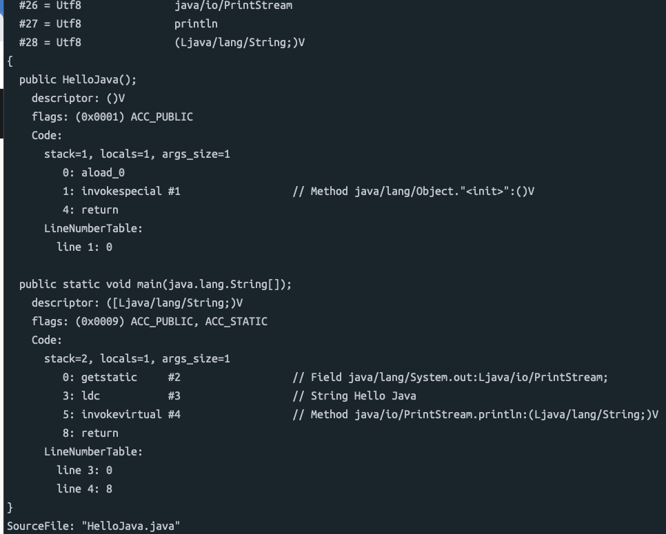 - 바이트코드의 명령어 크기는 1바이트. 따라서 바이트 코드라 불린다.